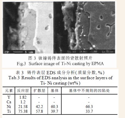 图3 是浇铸温度为1600 ℃钛镍铸件垂直界面处的背散射照片。从试样的高倍组织可以看出,试样由表面残留层、反应层、扩散层、基体等4个区域组成,其表面层实际上是由表面残留层、1.5μm 深度的反应层和4μm 厚度的扩散层组成。电子探针面扫描结果表明,B、N 元素主要富集在反应层,与此同时, 反应层中Ni 元素很少。在扩散层中Ni 含量要高于反应层中的Ni 含量,而少于基体中的Ni 含量;此外扩散层中有微量的N元素存在,可能是N 元素固溶在合金中;Y 元素则没有在扩散层中间测出。铸件表层的EDS 分析结果(见表3)与面扫描结果基本吻合。值得注意的是在反应层中的Ti 元素含量明显高于基体。