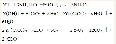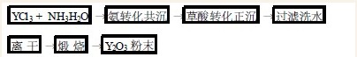 配好一定浓度的YCl3 溶液和氨水溶液,采用共沉方法制得Y(OH) 3 胶体,沉淀控制pH = 6~7 ,然后直接加热草酸水进行转化。转化后草酸钇经洗水、过滤,在马弗炉850 ℃灼烧2 h,即可制得Y2O3粉末。