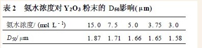 为保证稀土离子沉淀完全,需控制PH = 6~7 。因此,我们选用氨水稍过量,一是保证Y3+ 完全转化为Y(OH)3;二是使剩余OH- 不可过量太多,以免消耗H2C2O4 用量。试验结果表明,在选定YCl3浓度0. 4~1. 8 mol·L - 1 , 选择氨水浓度3. 0~15. 0mol·L - 1所获得Y2O3 粉末粒径在1~2μm 之间。见表2 。