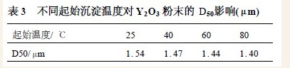 在氨转化共沉中,选择25,40,60,80 ℃等不同的起始沉淀温度下进行试验。试验结果表明,起始沉淀温度对最终所获得Y2O3粉末粒径影响不大。所选择温度高些,可以加快反应速度。见表3 。