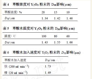 草酸转化实际上是一个中和反应。在反应中,我们对相关因素进行了研究。反应初,草酸需与过量的氨水反应,生成草酸铵和水,由于[NH4+ ]存在,使沉淀对饱和度的变化敏感度降低,且成核速度较快,生成的沉淀物更稳定、均匀性更好。试验结果表明,在所选定条件内,即草酸水浓度10~20 % ,草酸水温度60~100℃,草酸水加入速度快或慢,所获得Y2O3 粉末粒径均在1~2μm 之间。见表4,5,6。