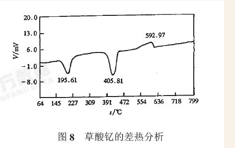 通过对草酸钇沉淀物做差热分析(见图8),可以看出有两个吸热峰和一个放热峰,这表明:在200°左右发生了脱水反应,405°草酸钇分解;600°左右有一放热峰,这个放热峰应是晶形转变有序化的过程。