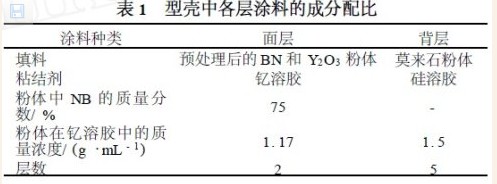 将适当比例、经过处理的氮化硼粉体和氧化钇粉体放入钇溶胶中,并加入少量添加剂(J FC 型表面活性剂、辛醇),配制成面层涂料,配比成分见表1 。将氮化硼基涂料均匀地涂挂在蜡型表面,撒100 目氧化钇砂,待涂层充分干燥再重复1 次,待型壳面层充分干燥后涂挂背层,背层涂料则由莫来石和硅溶胶组成,背层撒砂分别用40 目和20 目莫来石砂,重复5 次;待型壳充分干燥后,使用微波炉对型壳脱蜡;脱蜡后的型壳在焙烧炉中加热至850 ℃保温2 h ,随炉冷却。试验合金为Ti250Ni 形状记忆合金。型壳与TiNi 合金的界面反应试验在自制真空感应加热炉中进行:将TiNi 合金置于氧化钙坩埚中加热,感应炉内抽真空至7 Pa,然后往炉内充高纯氩气保护。合金浇注温度为1 600 ℃(对于TiNi合金为过热300 ℃)。待铸件温度降至室温后取出,为保留铸件表面反应层,铸件不采取喷丸酸洗处理,仅清理型壳后,线切割取样。使用S2570 扫描电镜及附带EDS 和JAX28100 型电子探针对试样作检测。试样的显微硬度在0. 1 N 负载下,由铸件表面开始每间隔30μm 测量一次,每个位置测量2 次,取平均值。