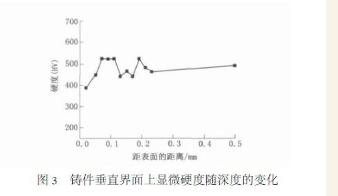 一般来讲,界面反应会导致表面层钛合金的N ,B元素含量发生变化,从而造成表面层钛合金相的变化,形成与基体有较大差异的相,出现了分层界面。并由于生成的异相,往往硬度较大,从而表现出较高硬度的反应层。然而,通过显微硬度分析,发现氮化硼复合型壳制备的钛铸件表面的反应层很薄。图3 是铸件垂直界面上显微硬度随深度的变化的情况。可以看到,表面层没有发现明显高硬度的反应层。除了深度小于0. 02mm 处的硬度有小幅度的变化外,并没有发现硬度非常高的硬化相。从理论上讲,由于钛液与BN 反应后,N、B 元素会向钛合金熔体中扩散,所生成的相(氮化物和硼化物),其硬度一般要比基体的硬度高很多。在试验中没有发现这种明显的反应层。因此可以说氮化硼基复合型壳与试验的钛镍合金熔体的反应较小。