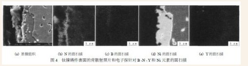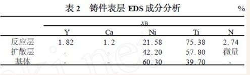 铸件表层不同部位的EDS 分析表明(见表2),在最表面的小于10μm 深度范围内,除了Ti 、Ni 元素外,还测得了Y、N、少量的Ca 和微量的B 元素;而继后的一层中(约几十μm 到一百多μm)除了Ti 、Ni 元素外,只测得微量或极少量的N 和B。