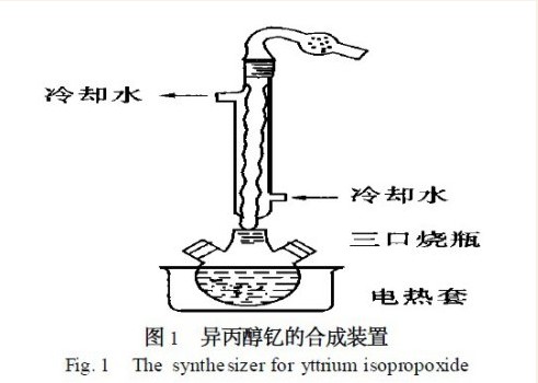 异丙醇钇的合成的实验装置如图1 所示,在450mL经除水后的异丙醇中加入20g 的金属钇碎屑,并加入30mgHgCl2 及30mgI2 为催化剂,摇匀,于82 ℃下回流,待反应较完全后(约需5 个小时左右),冷却之,过滤以除去未反应的残渣,滤液经减压蒸馏后便得到白色泡沫状的异丙醇钇固体。
