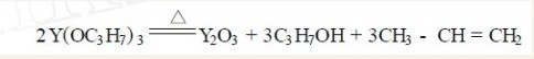 异丙醇钇的差重曲线表明:在加热过程中,醇盐随着温度的升高而发生分解。异丙醇钇的分解温度为307 ℃左右(在氩气气氛中)。在此阶段,由于〔Y(OC3H7) 3〕受热分解生成了Y2O3 及挥发性的C3H7OH 及CH3 - CH = CH2 ,造成重量损失对所生成的产物用ICP 发射光谱法进行分析,在固态产物中Y2O3 的含量达991.94 %,此结果与Mazdiyasni 的报道完全相同。该文献指出:异丙醇钇在加热过程中,在300 ℃左右发生热分解,热分解反应方程式为: