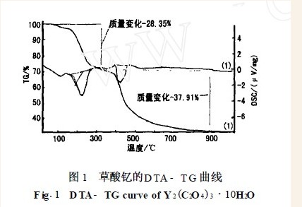 把Y (NO 3) 3·6H2O 与草酸按1∶2 (物质的量比)混合,在玛瑙研磨钵中研磨分散后放入玛瑙球磨罐中,用QM - ISP04 行星球磨机球磨3小时至反应完全,用SHZ- D (Ë ) 循环水式真空泵对固相反应产物进行抽滤,将抽滤后的粉体在H101- 1A型恒温干燥箱内50℃气氛中干燥,得到前驱体草酸钇粉末。然后对前驱体进行差热分析和热重分析以确定其分解温度,在KXX- 4- 10A 箱式电阻炉内进行热分解,得到纳米氧化钇粉体,再对所得到的氧化物粉末进行XRD、SEM 形貌观察及光谱分析。