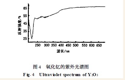 图4 为氧化钇的紫外光谱图,可以看出纳米氧化钇具有吸收和反射紫外光的双重功能,而且由于纳米粒子的小尺寸效应,纳米氧化钇对紫外光有较强的散射和反射作用,对紫外线屏蔽效率高,在抗紫外线老化方面有一定的应用。