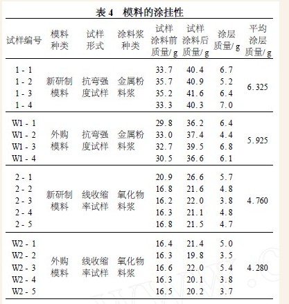 为了更直观地反映模料的涂挂性,将所研究的模料直接拿到生产现场进行涂挂试验,并与外购模料进行比较,试样为两种,一种是抗弯强度试样,另一种是收缩率试样,在两种涂料浆中进行涂挂,结果见表4。从浸涂料浆的试样外观来看,涂挂性几乎没什么差别,但在单位面积上涂挂涂层的质量,新研制模料比外购模料涂挂质量大,说明新研制模料的涂挂性比外购模料好。