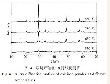 经550 ℃煅烧的样品呈弥散衍射峰,表明晶态前驱体分解为非晶态粉体。经650 ℃煅烧的样品已有明显的衍射峰,主峰对应于Y2O3,衍射峰较弱,表明Y2O3 开始晶化,但尚未完全。经750 ℃煅烧的样品,衍射峰有所加强,表明晶化现象渐趋完善。经850 ℃煅烧的样品则显示完好的衍射峰,没有其他任何杂相,表明为纯相Y2O3 粉体,由图4还可看出,Y2O3 随着煅烧温度的提高,衍射峰更加尖锐,宽度变窄,这说明晶粒尺寸随温度的升高而长大。