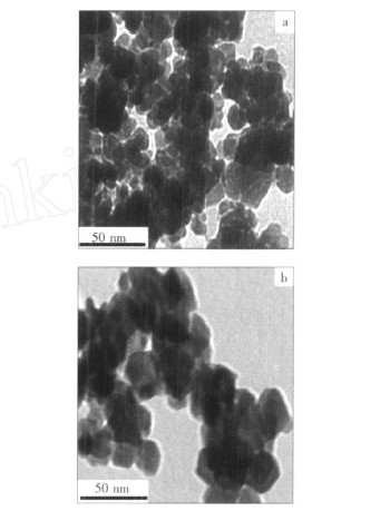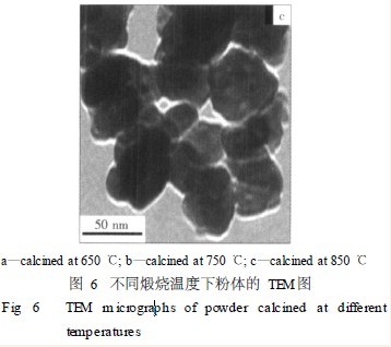 从图6a可以看出,在650 ℃时,有晶化现象,只是Y2O3尚未完全晶化。图6b表明,在750 ℃时,粉体晶化更加明显,Y2O3晶粒成立方体形,平均粒径在20 nm左右。从图6c可以看出,在850 ℃时,沉淀前驱体分解完全,粉体完全晶化,颗粒明显长大,粒径约38 nm,晶粒间的分界清晰可见,有少量物理上的键合引起的易于分散的软团聚,粉体分散良好。此结果与XRD和UV2Vis结果是一致的。