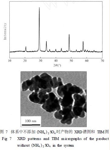 ( NH4)2SO4 对得到分散良好的纳米Y2O3 粉体也有一定贡献。据文献报道,SO4 2- 能够通过化学吸附而吸附在氧化钇前驱体的表面上,不易清洗除去,在煅烧过程中可有效阻止氧化钇的团聚。在其他条件相同的情况下,采取向前驱体生成体系中不加( NH4)2SO 和加入微量( NH4)2SO4 的方法进行了对比。图7为不添加( NH4)2SO时,在850 ℃下保温2 h所得Y2O 粉体的XRD谱图和TEM图,可以看出,Y2O3 的晶形较为完整,但一次颗粒之间存在明显团聚,颗粒尺寸不均,平均尺寸约为50nm。这说明( NH4)2SO 的加入,对解决干燥和煅烧Y2O3 前驱体过程中的团聚也起到了明显的作用。