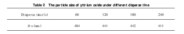 粉体的分散程度直接影响粒度的测定。氧化钇待测样品浓度0.025 mol/L,不同分散时间下的测量结果见表2。