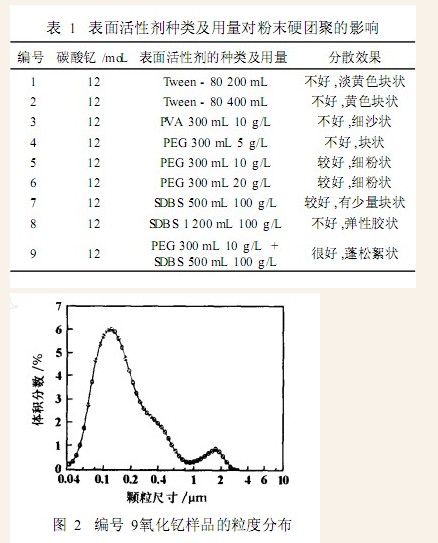 从表1可以看出,单独采用表面活性剂PVA,PEG,,Tween—80,SDBS的效果都不好,而同时采用PEG和SDBS作分散剂制得的氧化钇为蓬松状。图2为按表1编号9的添加方法制得的氧化钇样品粒度分布图。采用同时添加PEG,,SDBS分散效果好的主要原因为表面活性剂的协同效应。SDBS是非常好的起泡剂,在碳酸钇沉淀物滤饼中继续添加大分子表面活性剂PEG和起泡剂SDBS,在强力搅拌下吸入空气,在碳酸钇颗粒之间产生大量泡末,从而形成以高分子表面活性剂PEG和SDBS起泡剂为分散介质的碳酸钇沉淀物泡末分散体系。分散介质具有高分子网络结构,起到了隔离碳酸钇沉淀物颗粒之间相互接触的作用。在煅烧过程中,随着温度的升高,PEG和SDBS燃烧,并以二氧化碳、水蒸气的形式从颗粒之间排除,从而进一步起到了控制粉末硬团聚的作用。