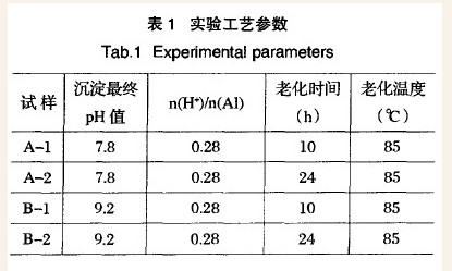 称取0.02mol的Al(NO3)3·9H20(A.P.上海科昌精细化学品公司),配成0.5mol/L的溶液,在室温下边搅拌边缓慢的滴加lmol/L的氨水(A.P.上海远大过氧化物有限公司),至pH=7.8得到沉淀A;滴加氨水,至pH=9.2得到沉淀B。沉淀无需陈化直接用去离子水冲洗,抽滤去除其中的NO3-离子,将沉淀重新用水分散,并在低于80℃时加入一定量的HNO3(A.P.武汉化学试剂厂)胶溶,分别在85℃密封老化10h和24h,得到透明的溶胶A—l、A—2、B—l,B—2。实验参数列于表l中。