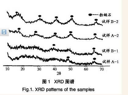 图l是试样的XRD衍射图谱。从图l中可以看出,沉淀时pH值较低的试样,其衍射峰较宽、较弱,并且随着老化时间的延长,衍射峰变强,这是由于无定形AlOOH在A1系的水解产物中溶解度最高,故当有碱性物质加入Al3+溶液中首先生成无定形沉淀,当pH值较低时(如pH<7),在老化过程中无定形沉淀不会发生溶解—重结晶反应而析出勃姆石颗粒。在较高pH值即碱性条件下,能促使溶解一重结晶反应发生,生成勃姆石颗粒。与此同时,在老化过程中,适当地提高老化温度可以加快溶解—重结晶反应速度,因为在碱性条件下,形成γ—AIOOH只需要很短的时间,从无定形沉淀转变为勃姆石的速度比勃姆石向拜耳石转变的速度快的多;另一方面,在酸性条件下(pH≤5),三水铝石(gibbsite)很快生成。