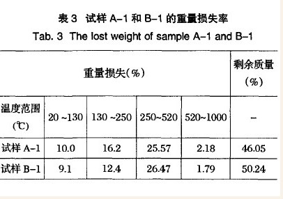 对试样A—l和B—l进行TG-DTA分析,结果如图2和图3所示。试样的测试温度范围为20~1100℃,升温速率为30℃/min,质量损失数据如表3所示。