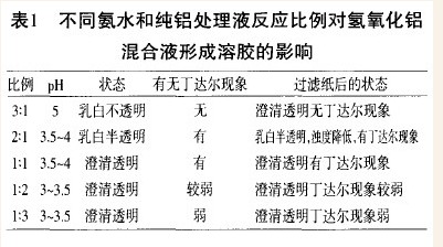 从表1中可以看,当氨水:纯铝分别为2:1、1:1时氢氧化铝混合液有丁达尔现象,这说明已形成了很好的溶胶;而为1:2时,丁达尔现象较弱,这说明溶胶颗粒很细。采用其它的比例都没能制成溶胶溶液。
