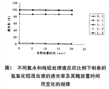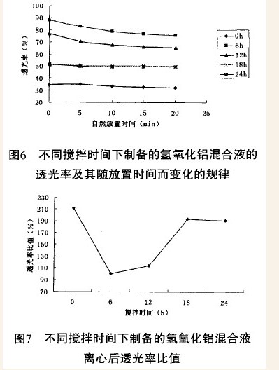 将氢氧化铝混合液用分光光度计测定其自然放置每隔5min的透光率(20min内)和离心5min(2000r/min)后上清液的透光率,用于表示溶胶的稳定性。
