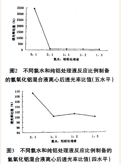 从图2可以看出,3:1制备的混合液离心后透光率比值最大;当比例下降到2:1时离心后透光率出现了急剧下降的现象;而当比例依次变为1:1、1:2和1:3时,离心后混合液的透光率都接近100%,变化的幅度很小。这一结果说明比例为3:1时形成的颗粒最大,超过了溶胶范围,氢氧化铝被离心力沉降下来了。而当比例分别为2:1、1:1、1:2和1:3时,已经形成了较稳定的溶胶。由于在含了3:1比例的图2中,很难从图中看出比例依次为2:1、l:1、1:2和1:3时的变化规律,所以在拿去比例3:1的数据后而绘出图3。从图3可以看出当氨水比例为1:1时,离心后混合液的透光率最接近100%,这说明此比例制备的混合液可以形成较好的双电层结构,制备的溶胶比较稳定。