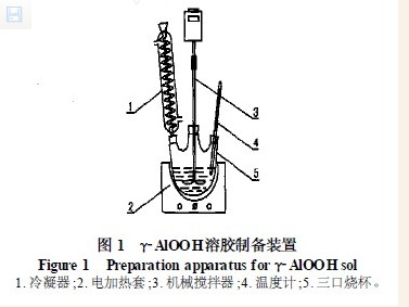 将去离子水加热至设定温度,边搅拌边将称重后的SB 粉加入,回流搅拌1 h,,然后按一定比例加入硝酸胶溶剂使SB 粉胶溶,最后使胶体在回流搅拌6 h 后陈化过夜,加入添加剂,制得稳定的γ-AlOOH 溶胶,实验装置见图1 。