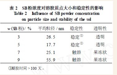 在n(H+ )/ n(AlOOH)= 011 、胶解温度为80 ℃条件下,考察了SB 粉浓度对AlOOH 胶体的质点大小和溶胶稳定性的影响,结果见表2。