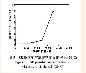 在n(H+ )/ n(AlOOH) = 0.1 不加添加剂的条件下,考察了SB 粉浓度对AlOOH 胶体粘度的影响,实验结果见图5 。