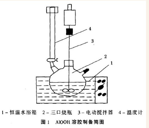 以异丙醇铝为原料,将异丙醇铝溶于异丙醇,溶液在85℃高速搅拌的过量蒸馏水中水解,加入适量的硝酸作胶溶剂,将形成的水解产物在一定温度下胶溶。老化一定时间,形成勃姆石AIOOH溶胶。