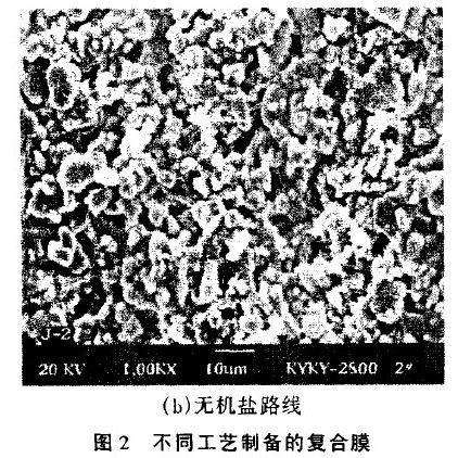 由图2可以看出,无机盐先驱体制备的复合膜与醇盐先驱体所制备的膜微观形貌相似,膜表面由片状粒子连接而成。醇盐路线制得的无机膜孔径较大,为4—5μm,单位面积孔的数目较少。通过对无机盐路线工艺过程的调整,可制得孔径为2—3μm且分布较均匀,使单位面积孔的数目更多,见图2(b),这样即可达到更精细的过滤效果。