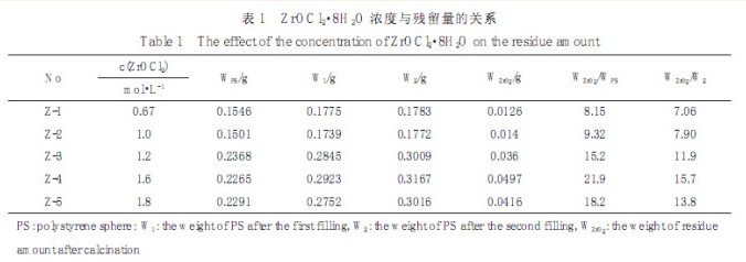 表 1 列出了制备过程中各个阶段样品的质量、焙烧后残留量与胶晶的质量比(WZrO2/WPS)以及残留量与焙烧前干基的质量比(WZrO2/W2). 表中数据显示,第一次和第二次浸泡后 ZrOCl2 在微球间隙的填充量(W1, W2)都随浓度的增加而增加, 而且第一次浸泡的填充量(W1)比第二次(W2-W1)的高. 当浓度低于1.0 mol·L-1时, 第二次浸泡后增加的量很小, 表明在较低的浓度下, 增加浸泡的次数并不能有效增加填充量. 当浓度达到 1.8 mol·L-1时, 填充量反而减小.这可能是由于浓度较高时, 粘性增加, 流动性降低,使得胶晶中心部分区域得不到有效填充.