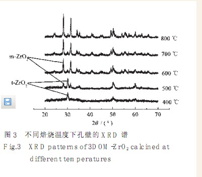 图3是在不同焙烧温度下所得3DOM-ZrO2 孔壁的 XRD 图. 由图中可看到: 在400℃下, 孔壁晶型属于四方 ZrO2, SEM 分析显示大孔排列有序; 在500 ℃下焙烧所得的样品含有两种晶型(四方及单斜ZrO2), 表明在该温度下开始发生晶型转变, SEM 分析显示大孔排列仍然有序; 从 600 ℃到 800 ℃, 孔壁晶型均是单斜 ZrO2, 晶型比较稳定, 没有晶相转变.SEM 及 TEM 显示 600 ℃及 700 ℃焙烧的 3DOM-ZrO2 孔壁收缩不大, 孔道排列十分整齐. 但 800 ℃下焙烧的样品有序范围不大, 出现较大的孔洞, 孔径在 400~450 nm 之间, 孔壁收缩较大. 说明过高的温度会导致孔道的过度收缩, 从而使得孔壁崩溃, 破坏了大孔的长程有序排列. 电子能谱分析表明, 在400、 500 和 600 ℃下焙烧所得样品中氯的摩尔分数分别为 13.86%, 6.00%和 3.10%. 表明在低于 500 ℃的温度下焙烧, ZrOCl2 分解不完全, 所得 3DOM-ZrO2 中氯的摩尔分数高. 当焙烧温度高于 600 ℃时,分解基本完成, 氯的摩尔分数也有了大幅度降低. 由此可见, 较适宜的焙烧温度应该在 600~700 ℃.
