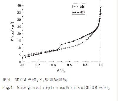 图4是3DOM-ZrO2孔壁的 BET 吸附等温线,为典型的IV 型. 从图中可以看到, 在很低 p/p0 值下曲线出现拐点, 而且在很大的 p/p0 值范围, 吸附体积缓慢增加,这些表明 3DOM-ZrO2 孔壁中孔径较小. 实验测得的 3DOM-ZrO2 的比表面积 SBET 仅为23m2·g-1, 说明 3DOM-ZrO2 孔壁为非多孔性. 这些结果与在TEM下观察到的具有平板状晶体的孔壁结构非常吻合.