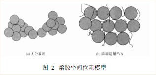 溶胶空间位阻模型见图2。由图中可知 ,新制备的ZrO2溶胶凝胶胶粒大小是均匀分布的 ,由于溶胶粒径小 ,比表面积大,界面原子数多,化学活性高,存在大量不饱和键 ,经过一段时间的陈化,有些胶粒长得快,有些胶粒长得慢 ,造成溶胶体系胶粒分布不均;由大小不均的胶粒组成的薄膜干燥烧结后有大的团聚产生,导致薄膜不光滑若在刚制备的溶胶中加入 PVA,线性的 PVA分子将包裹在氧化锆胶粒的周围 ,互相空间位阻效应增强,抑制了溶胶胶粒的长大。PVA的高分子基质使纳米团簇得以稳定 ,延长了溶胶的使用寿命 ,提高了溶胶的稳定性。
