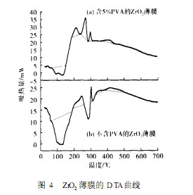 干凝胶向最终材料转变必须通过热处理 ,这种转变过程包括:毛细收缩;缩聚作用;结构松弛;粘性烧结。根据ZrO2薄膜的DTA曲线可以确定薄膜的预烧结温度和烧结温度。ZrO2薄膜的DTA曲线见图4。