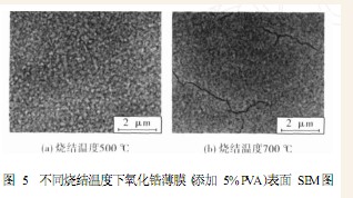 不同烧结温度下氧化锆薄膜(添加5%PVA)表面的扫描电镜照片见图5。经过6次反复涂膜预烧结处理的薄膜 ,在不同的温度下进行烧结处理,500℃下烧结处理的薄膜均匀无裂纹,而700℃的有显微裂纹出现。微裂纹的产生是由于薄膜与基底的热膨胀系数不同而导致的。温度越高热膨胀系数的差异作用越明显 ,不同的热膨胀率在薄膜中引起较大的内应力 ,最终导致裂纹的产生。