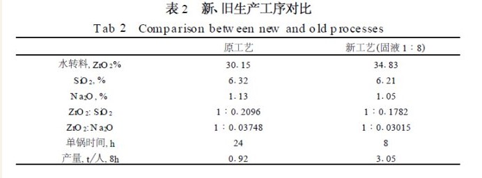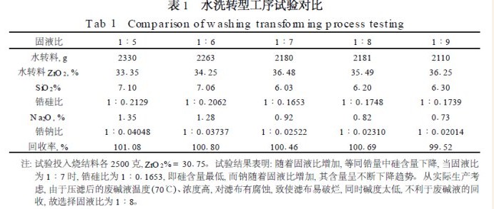 经对工艺多次、多因素试验, 结果表明, 最有突破的且能取得很好经济效益的是“水洗转型”工序和“硅渣洗涤”工序(即逆流洗涤工艺)。其他试验已有验证, 不再重复。本研究重点对以上两工序作了大量工作。水转工序其主要目的是除硅、钠, 是整个工艺的主要工序, 关系到锆的回收率和二次废酸的循环利用, 因为每公斤二氧化硅产生十公斤的硅渣, 且吸附大量的锆,在弃置的硅渣中流失。而钠含量高将会在二次结晶时呈盐份析出导致产品不合格和二次废酸循环次数减少, 需排放废酸(废酸成分: 二氧化锆35~40g/L 、HCl5.5~ 5.7mol/L 有害成分为Na2O) 造成锆和酸的流失。并做了对比分析。改进后的工序能取得相当可观的经济效益。