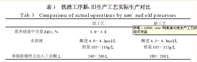 具体表现在: (1) 洗渣中二氧化锆回收率: 硅渣中二氧化锆含量降低了2.2% , 回收率提高了4.64% , 创造价值278.4万元; (2) 用回收的冷凝酸洗涤硅渣, 使水溶液浓缩后的终点工业盐酸的加入量减少了936 吨, 创造价值56.16万元, 并减少了酸雾对环境的污染; (3) 水转料中二氧化硅含量比旧工序降低了15% , 减少了硅渣吸附氧氯化锆, 使回收率提高了1.33% , 创造价值79.8万元; (4) 水转料中氧化钠含量比旧工序减低了19.6% , 使产品质量得到提高;二次废酸的使用周期延长。按10000 吨/年计算, 增加氧氯化锆产品597吨, 折合人民币358.2万元; 节约用酸量936吨(不包含氧氯化锆焙烧成二氧化锆工序中盐酸的回收) , 折合56.16万元, 每年可节约资金414.36 万元。若年产18000 吨, 可节约资金745.848 万元。
