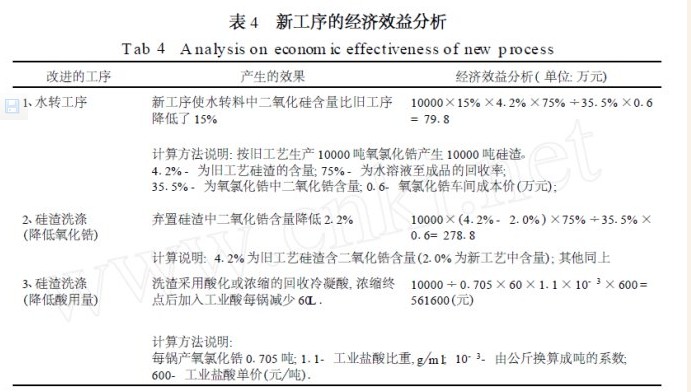 通过几年的不断探索、研究、改进取得了突破性的进展。简化了生产工艺流程、提高了氧氯化锆的回收率(即增加了产品的产量)、降低了原材料(盐酸) 的消耗、减少了废酸排放量。既产生了经济效益又具有社会效益。经多个部门共同联合跟踪考察核实, 认为其经济效益是可观的。
