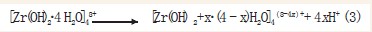 将氧氯化锆配制成溶液时,ZrOCl2·8H2O溶解于水中形成水合锆离子,其主要形式为[Zr(OH)2·4H2O]48+四聚体。在每一个四聚体中,4个锆原子以四方形的形式排列,并且每一个锆原子有4个架桥羟基和4个水分子配位。由四聚体中配位水的脱质子作用而释放出H+,其过程可由下式描述: