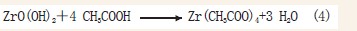 由于强酸HCl的存在,溶液的pH值较低(约为0.9),限制了反应的持续进行,使锆溶胶较难形成。加入碱性溶液虽可调节溶液pH 值,打破(3)式的平衡,使反应向右进行,但加入的碱性溶液易引起溶胶粒子沉积或引入杂质离子。为了抑制反应速度,加入一定量的冰醋酸来控制沉淀速度,以期生成稳定的溶胶。冰醋酸发生了如下螯合反应: