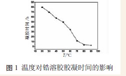 由于各种实验条件的影响,溶胶的稳定性很难定量测定,只能通过放置时间来比较。ZrOCl2·8H2O溶液浓度为0.25 mol/L;冰醋酸浓度为30%;调节pH值为5.0。其他条件相同,考察不同水解反应温度对胶凝时间的影响,如图1 所示。