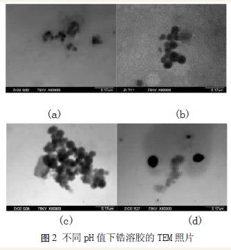 反应温度为60℃;ZrOCl2·8H2O溶液浓度为0.25 mol/L;冰醋酸浓度为30%。图2为锆溶胶的透射电镜照片。可见,溶胶-凝胶法制备的锆溶胶胶粒是由更小的胶粒聚集而成的,胶粒呈绒球形,颗粒极小,分布均匀,分散效果较好,但在不同pH 值下胶粒的大小有所差异。锆溶液浓度在一定范围内,随pH 值的升高,胶粒粒径有所增大。pH=2.0时胶粒大小约在10~20 nm[图2(a)],pH=4.0 时胶粒大小约35~45 nm[图2(b)],pH=5.0 时胶粒大小约为50~60 nm[图2(c)],pH=6.0 时胶粒大小约为70~80 nm [图2(d)]。