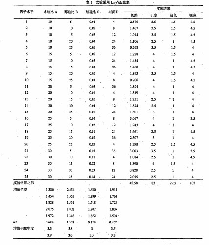 二氧化硅溶胶的制备工艺有待于进一步确定. 由正交实验得出二氧化硅溶胶制备的最佳工艺: 水硅比为4 ; 醇硅比为5 ; 酸硅比为0.02 ; 放置时间为4 h , 在实验中发现水硅比越小其色差越小,各项牢度也趋于变好,但水的量太少容易使得正硅酸乙醋不能充分水解,使得制备的溶胶不纯,同时一些研究也表明水硅比在4 时其稳定性最好,因此本实验取得水硅比的值为4 . 按此工艺制备的二氧化硅溶胶用于活性染料固色取得的效果最好.