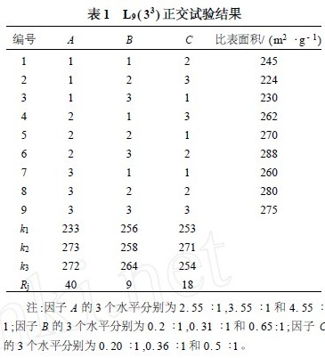 由于本研究的目的是制备用于橡胶补强的纳米二氧化硅,为达到良好的补强效果,纳米二氧化硅与MVQ 间应存在尽可能多的作用点,即要求纳米二氧化硅的比表面积尽可能大,因此将纳米二氧化硅的比表面积作为主要考察指标。而由于TMOS 在碱性环境中的水解转化率和水解产物的缩聚转化率都接近100 % ,因此本研究不以转化率或收率作为正交试验考察指标。在固定碱性催化剂种类和其它反应条件(温度 恒定20 ℃,搅拌反应时间 2 h ,陈化时间 6 h ,表面活性剂与絮凝剂用量恒定) 的前提下,选取因子A (水与TMOS 的摩尔比) , B ( HMDS 与TMOS 的摩尔比) 和C(氨水与TMOS 的摩尔比) 进行三水平正交试验,结果见表1 。
