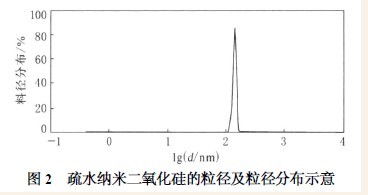 取少量疏水纳米二氧化硅甲苯分散液超声分散于无水乙醇中进行激光粒度测试,粒径及粒径分布如图2 所示。