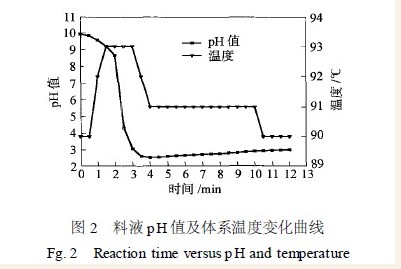 由于超重力环境可使成核过程在微观均匀的环境中进行,从而使成核过程可控,粒度分布化。所以本实验没有采用传统的制备晶种和分段加酸法,而采用了连续一次性加酸反应。反应过程中料液pH 值及体系温度随反应时间的变化如图2 所示。
