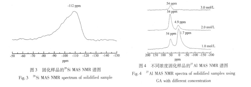 27AlNMR谱图提供 Al原子周围的结构信息。研究表明 ,AlO6 (V I配位 )化学位移位于 016 ppm,AlO4( I V配位 )化学位移位于 5580 ppm,Al O5 (V配位 )化学位移位于 2335 ppm 。为了进一步了解氯化铝固化样品中铝配位数的变化及其聚合反应过程 ,本文进行了不同浓度氯化铝溶液固化样品的27Al NMR试验。图 4是固化样品 (固化剂浓度分别为 1 mol /L 2 mol /L 3 mol /L,胶凝剂与固化剂的体积比均为 4∶1)27AlNMR谱图。由图 4可知: 1 mol /L的氯化铝溶液固化样品的主峰位置在 1 . 77 ppm附近 , Al V I配位为主 ,也有 I V配位 Al ; 2 mol /L的氯化铝溶液固化样品的主峰位置在54 ppm附近 , Al I V配位为主,仍有 V I配位存在; 3 mol /L的氯化铝溶液固化样品只有54 ppm附近一个峰,仅有 I V配位的 Al存在。因此,随着氯化铝溶液浓度的增大 ,化学位移向化学位移小的方向移动 , 54 ppm附近的共振峰表明更多的 Al3 +[ Si O4]连接或者说更多的 Si4+ Al3+取代 ,聚合物的聚合程度越高 ,生成的铝硅酸盐聚合物就越稳定 ,其耐水性也越好。