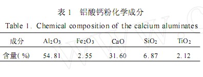 铝酸钙其主要成分为铝酸一钙(CaO ·Al2O3)。铝酸钙极易溶于盐酸,在较低酸浓度时 ,其铝溶出率也可达 90 %以上 ,且价格低廉 ,因此是生产氯化铝的主要原料之一。实验采用的铝酸钙为贵州银都耐火材料厂生产的铝酸钙粉 ,是用贵州低铁铝土矿加入碱性矿化剂石灰石等经破碎、煅烧、磨碎而成,具体成分如表 1 所示。