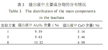 固定铝酸钙粉加入量为100 g、根据铝酸钙粉中Al2O3、CaO、Fe2O3 含量以及盐酸的浓度计算出盐酸的理论用量~610 mL。考虑到铝酸钙粉中还存在某些可酸溶组分 ,应适当加大盐酸的用量 ,因此分别采用盐酸为 600 mL、650 mL、700 mL(表 2 中方案 1、2、3)。实验结果表明 ,盐酸的用量对铝的浸出影响较大 ,随着酸用量的增加 , Al2O3浸出率相应升高。但当盐酸用量大到一定程度时 ,增加幅度变小。因此 ,铝酸钙粉与盐酸的合理配比(g∶ml )为 1∶6.5。